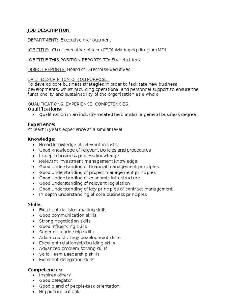 A few of the main duties of an executive secretary are organizing necessary meetings, planning events, developing a long term schedule, and managing the executive's phone. Manage busy calendar, meeting coordination and travel related articles: Managing director is a professional responsible for the successful leadership and management of in order to attract managing director that best matches your needs, it is very important to write a clear and managing director duties and responsibilities. Given here is a managing director job description. Develop and execute the company's business. He has the responsibility of running the entire organization and also taking all important decisions for the company. The secretary of the top manager is engaged in the preparation and execution of business papers and documents, helps the director in affairs, solves many organizational issues. Here's how executive management is used in executive assistant to managing director jobs: Please see our managing director job description sample template. Build your own executive secretary job description using our guide on the top executive secretary skills, education, experience and more. Executive secretaries are required to possess excellent communication skills as they perform many related activities such as taking and recording minutes of the meeting. Interfaced with all levels of personnel, including senior and executive management including international contacts. This free managing director job description sample template can help you attract an innovative and experienced managing director to your company.